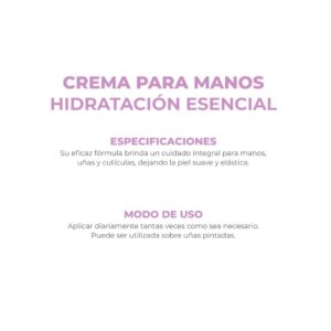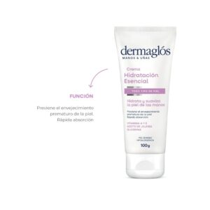 Dermaglós Corporal Crema para Manos Hidratación Esencial ofrece un cuidado integral para manos, uñas y cutículas, dejando la piel suave y elástica. Esta crema está diseñada para brindar una hidratación profunda y duradera por 24 horas. Su fórmula hipoalergénica y libre de parabenos está especialmente formulada para la piel sensible, siendo además testeada dermatológicamente y no testeada en animales. Puede ser utilizada sobre uñas pintadas, brindando un cuidado completo para manos y uñas.