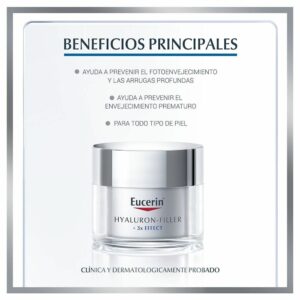 La Crema Antiarrugas de Día Eucerin HYALURON-FILLER ayuda a reducir visiblemente las líneas de expresión y las arrugas para una apariencia rejuvenecida. Su fórmula combina Ácido Hialurónico con la Saponina Bioactiva, ingredientes que mejoran los niveles de retención de humectación y suavizan las arrugas. Con el uso regular, la piel luce suave y más joven. Además, contiene FPS 30 y protección UVA para prevenir efectivamente el envejecimiento prematuro y que las arrugas existentes se vuelvan más profundas.