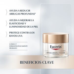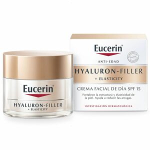 La Crema Antiedad de Día Eucerin HYALURON-FILLER + Elasticity fortalece la estructura de la piel, mejora la elasticidad y tiene un efecto relleno de arrugas. Contiene FPS 15 y filtro UVA para brindar mayor protección contra los rayos solares que pueden profundizar las arrugas y acelerar el proceso de envejecimiento de la piel. Su fórmula exclusiva e innovadora contiene Arctiína, Silimarina y Ácido Hialurónico, ingredientes que permiten que la piel luzca fresca y radiante. Además, posee Aceite de Cardo Mariano que actúa en conjunto para hidratar y nutrir intensamente la piel. Está probada en todo tipo de pieles.