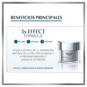 La Crema antiarrugas de noche Eucerin HYALURON-FILLER ayuda a reducir visiblemente los signos de envejecimiento y genera un efecto relleno de arrugas para que la piel se sienta suave y cuidada. Su fórmula combina dos ingredientes claves: Ácido Hialurónico y Saponina Bioactiva, que actuán y tratan todos los tipos de arrugas. También posee Dexpantenol concentrado que apoya el proceso de regeneración de la piel durante la noche. Está probada en todo tipo de pieles.