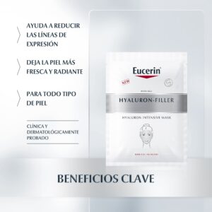La Máscara Intensiva Antiedad Eucerin HYALURON-FILLER brinda hidratación inmediata a la piel en solo cinco minutos. Además, reduce las líneas finas de expresión, dejando la piel más fresca, radiante y rejuvenecida. Su fórmula contiene una mezcla de Ácido Hialurónico de alto y bajo peso molecular. Estos ingredientes ayudan a disminuir visiblemente los signos del envejecimiento. La mascarilla hidratante y antiedad está hecha de biocelulosa, un material biodegradable de origen natural que es fácil de aplicar, se adapta perfectamente a los contornos faciales sin deslizarse y se siente tan cómodo como una segunda piel. Es adecuada para todo tipo de pieles.