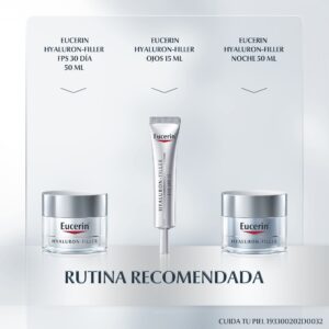 5) Continuar con una crema hidratante adecuada; entre las opciones más recomendadas están Eucerin Hyaluron-Filler Crema de Día FPS 15 o FPS 30; Eucerin Hyaluron-Filler Crema de Noche y/o Eucerin Hyaluron-Filler Contorno de Ojos FPS 15.