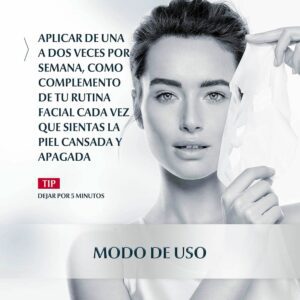 4) Quitar suavemente la máscara y desecharla, masajeando el serum restante en su piel. Se sugiere utilizarla una o dos veces por semana como complemento de la rutina facial.