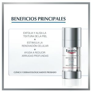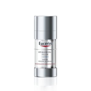 El Sérum efecto peeling Eucerin HYALURON-FILLER + 3x Effect es un producto nocturno de acción dual que exfolia y refina la textura de la piel, promoviendo la renovación celular superficial y ayudando a rellenar las arrugas. Además, la emulsión contiene dos ingredientes principales: el efectivo complejo AHA (Álfa Hidroxi Ácidos) compuesto por ácidos frutales que exfolian la piel, y la Saponina de Glicina que estimula la producción de Ácido Hialurónico en la capa de la dermis donde se originan las arrugas. Por eso, la piel lucirá más suave con textura y luminosidad. Está probado en todo tipo de pieles.